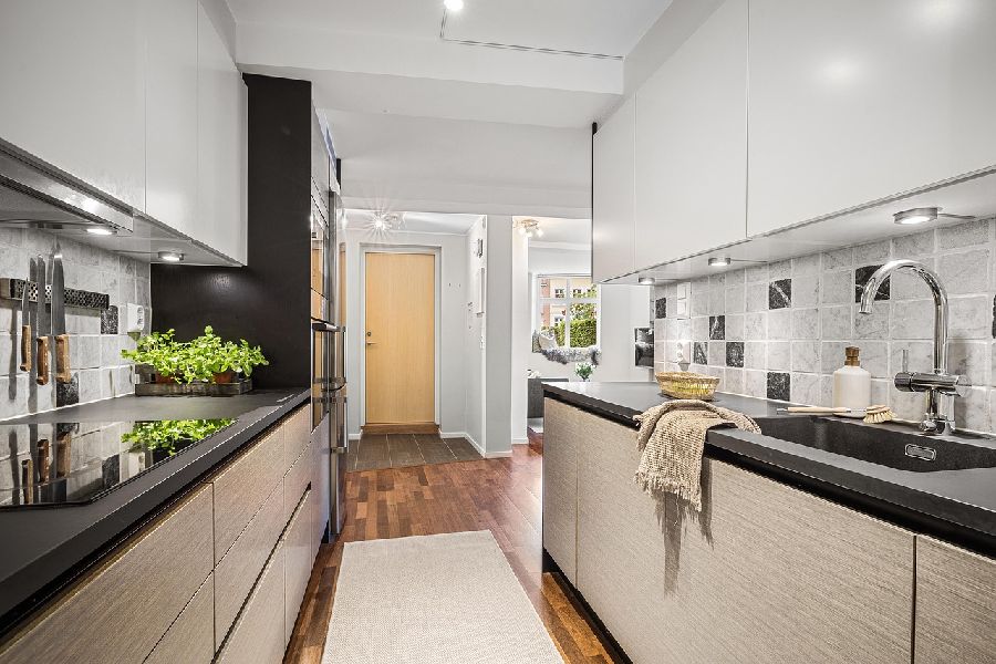 Với những căn bếp hành lang có chiều dài lớn, bạn có thể cân nhắc sử dụng hai thảm runner cũng là giải pháp hiệu quả.